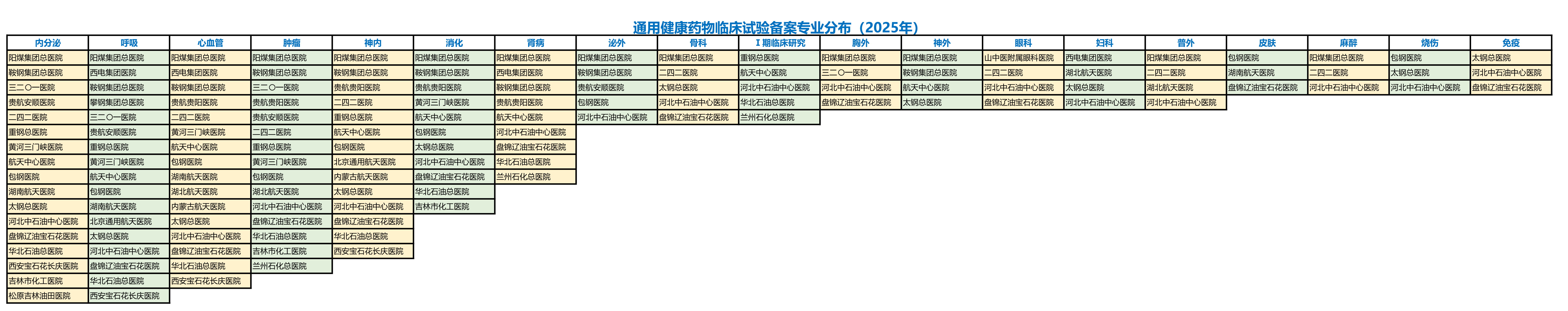为方便药物临床试验申办者快速了解通用健康GCP专业备案情况,提高沟通效率,特发布2025年版通用健康药物临床试验备案专业分布,请相关单位参考。